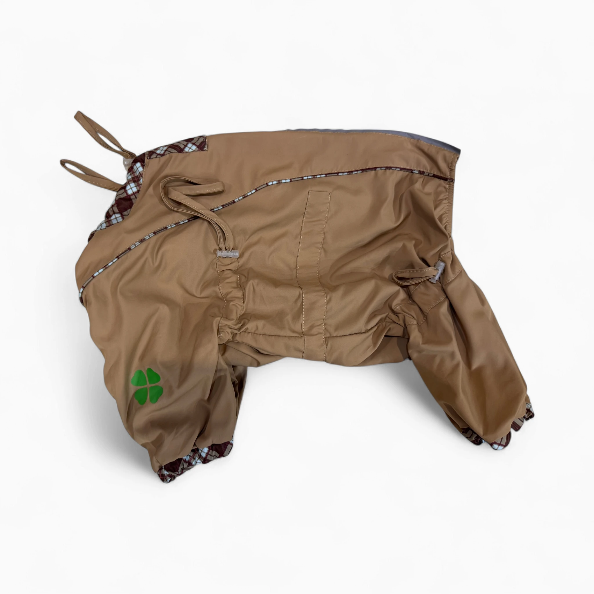Данная модель с закрытым животом для девочки. Дождевик «Клевер 2» идеален для стильных прогулок вашей собаки. Бежевый комбинезон с клетчатой отделкой и зеленым клевером подарит питомцу комфорт и элегантный вид в любую погоду.