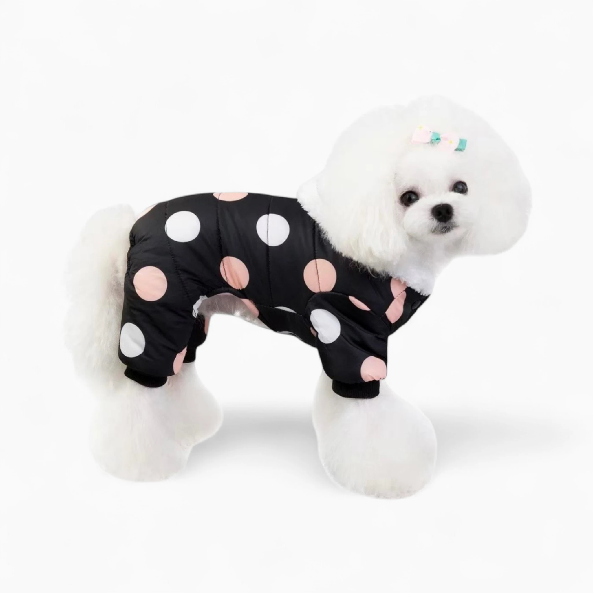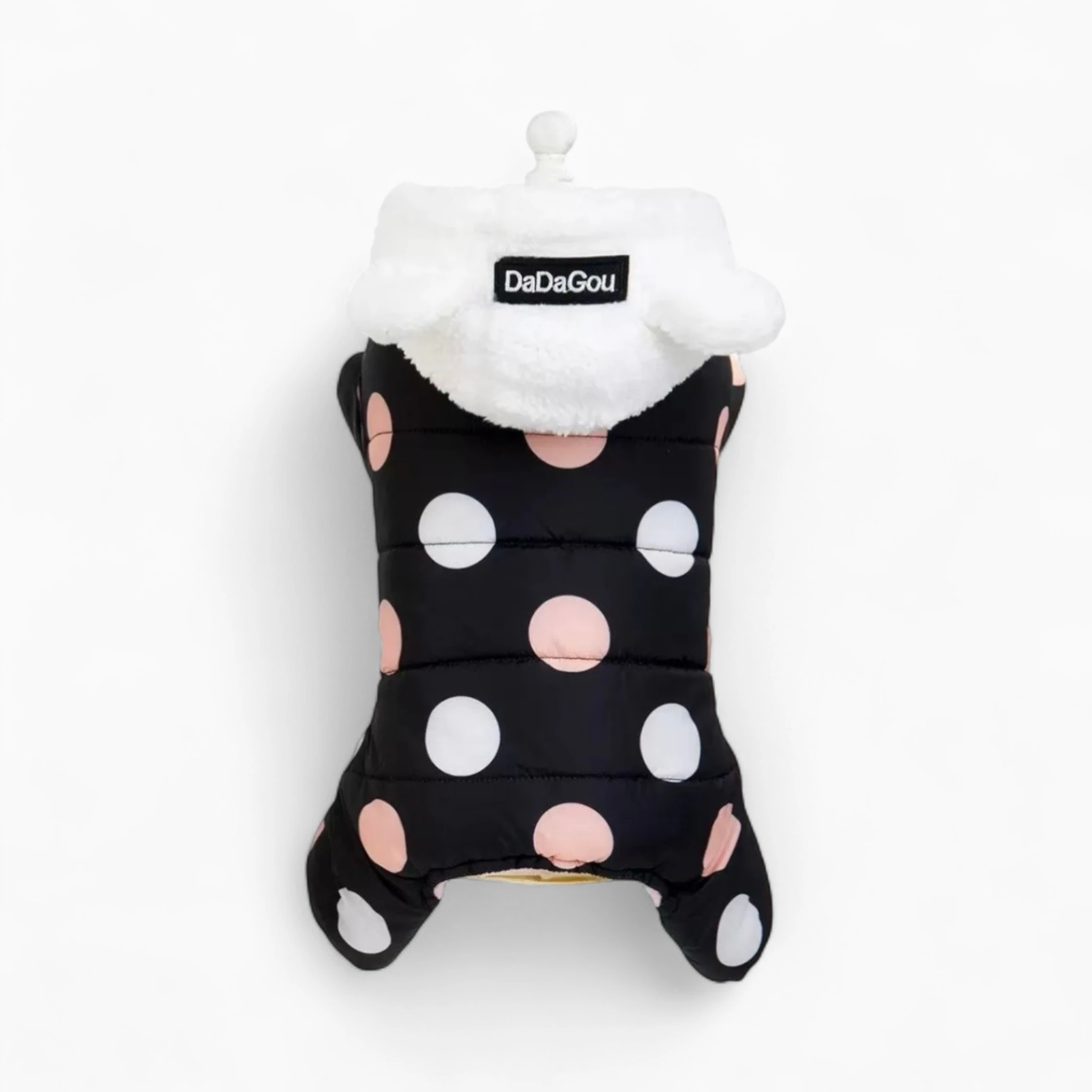 Подарите питомцу стиль и уют с Комбинезоном для собак «Cow» от "Офелия". Этот очаровательный наряд с игривым дизайном в черно-белый и розовый горошек и пушистым капюшоном-ушками идеален для прохладной погоды, делая прогулки комфортными и яркими.