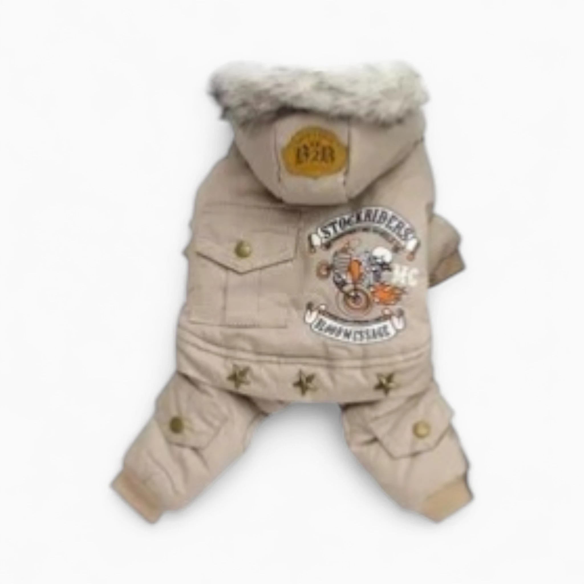 Выполненный из износостойкого, непродуваемого материала бежевого цвета, комбинезон надежно защищает от ветра. Мягкая внутренняя подкладка и утеплитель обеспечат тепло. Роскошный капюшон с искусственным мехом, байкерская нашивка, металлические звезды и декоративные карманы придают уникальный вид.