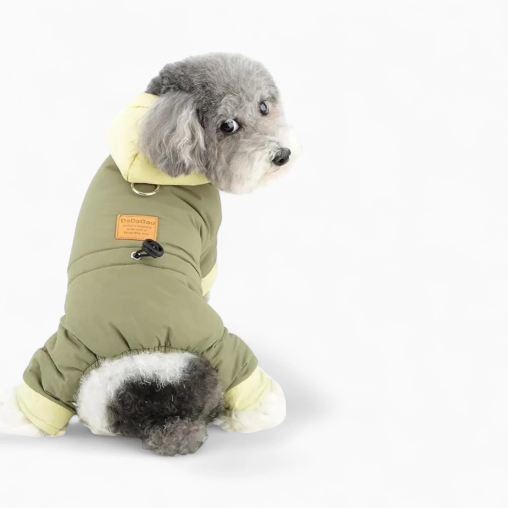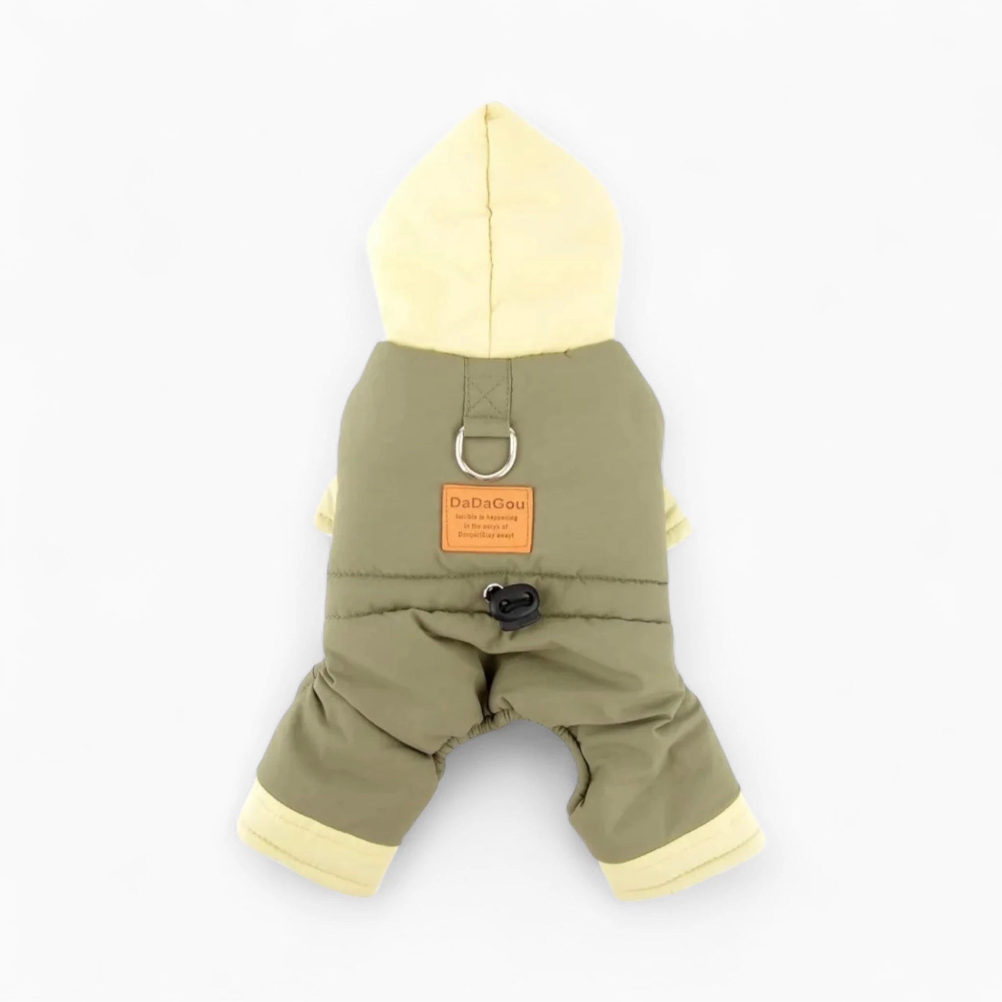 Продуманный дизайн включает в себя удобный капюшон для дополнительной защиты от непогоды, а регулируемый эластичный шнурок на поясе обеспечивает идеальную посадку, не стесняя движений собаки. Интегрированное D-кольцо на спине позволит легко пристегнуть поводок, делая каждую прогулку беззаботной для вас и вашего питомца. Элегантное сочетание оливкового и светло-желтого оттенков придаст вашему четвероногому другу неповторимый шарм.