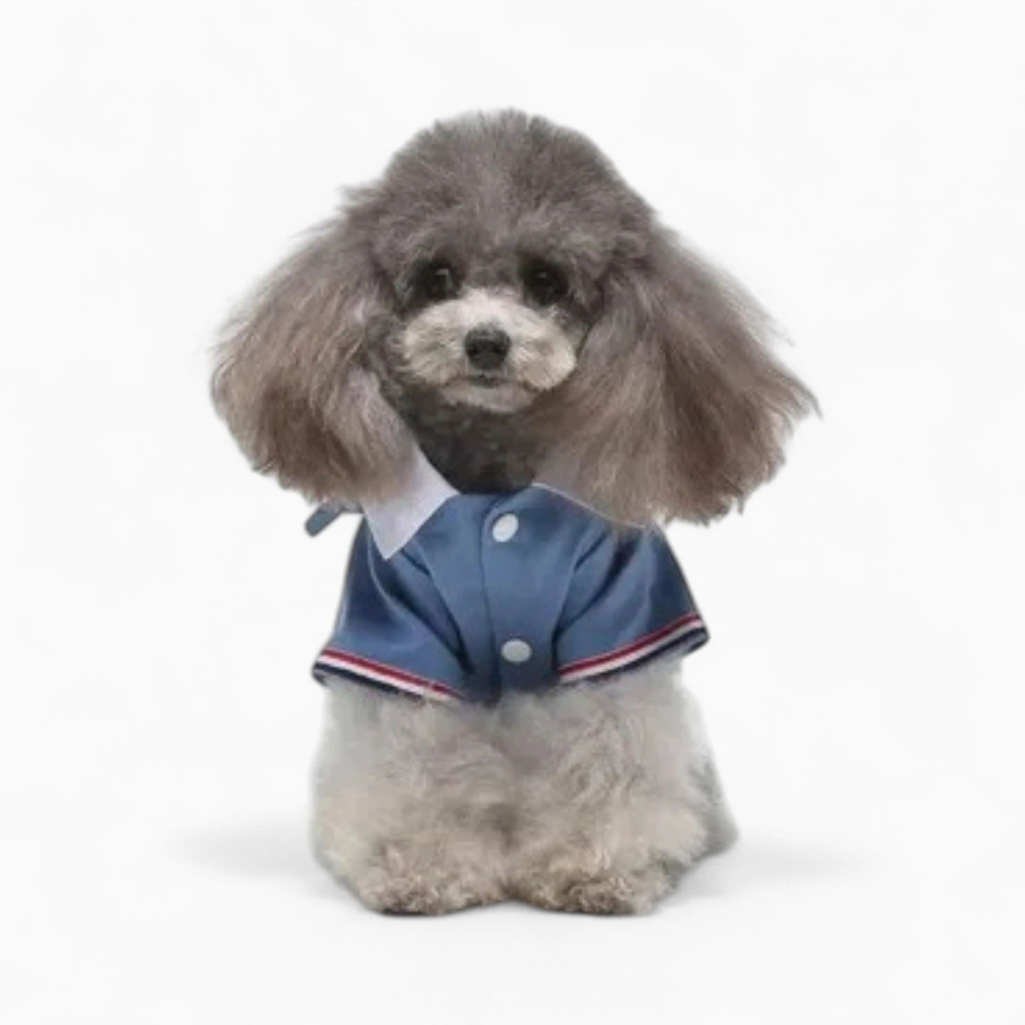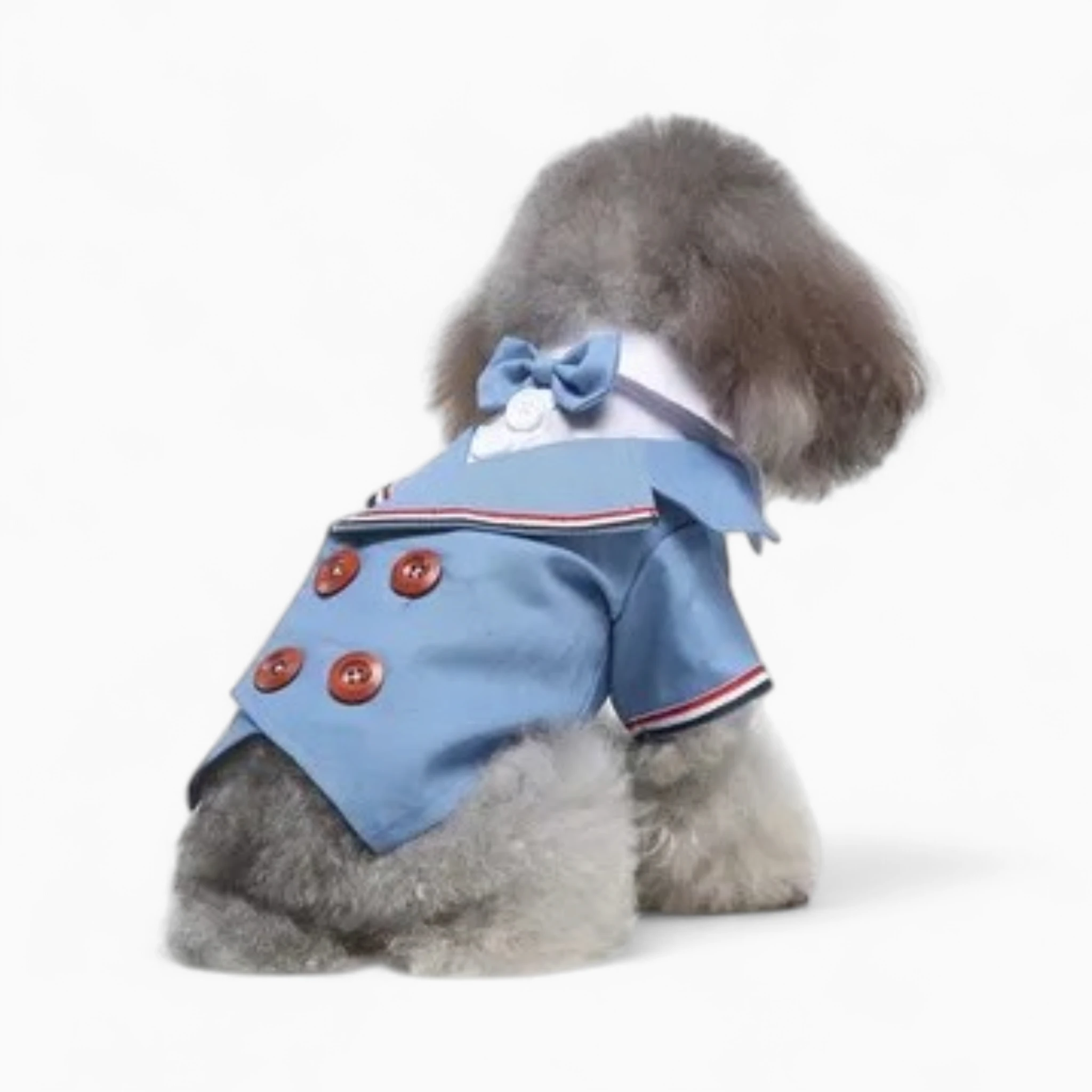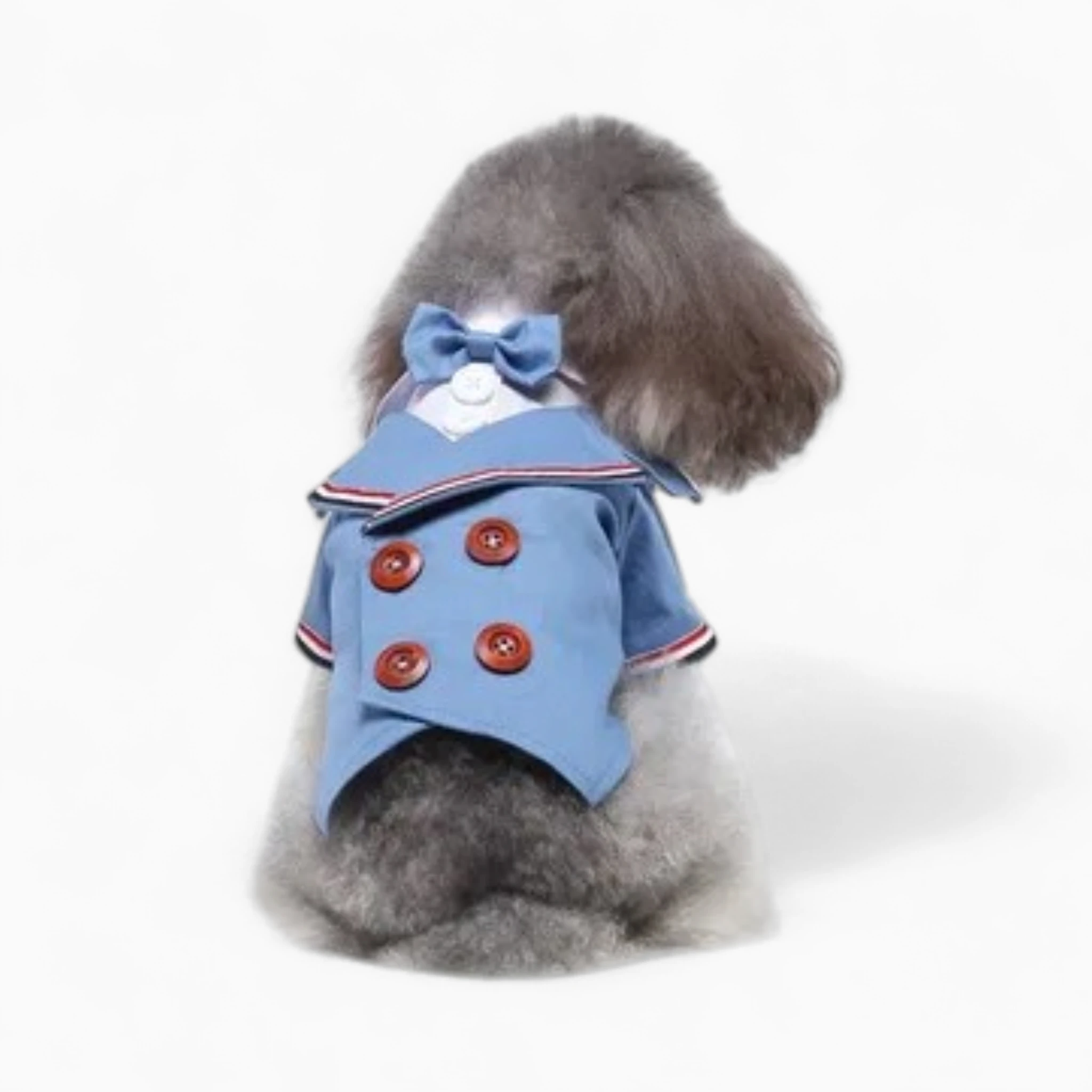 Свободный крой не стесняет движений, что важно для активных собак. Стильный морской воротник с контрастными полосами, двойной ряд декоративных пуговиц и очаровательный галстук-бабочка создают завершенный, фотогеничный образ. Идеален для прогулок, праздников и ярких фотосессий, привлекая восхищенные взгляды.