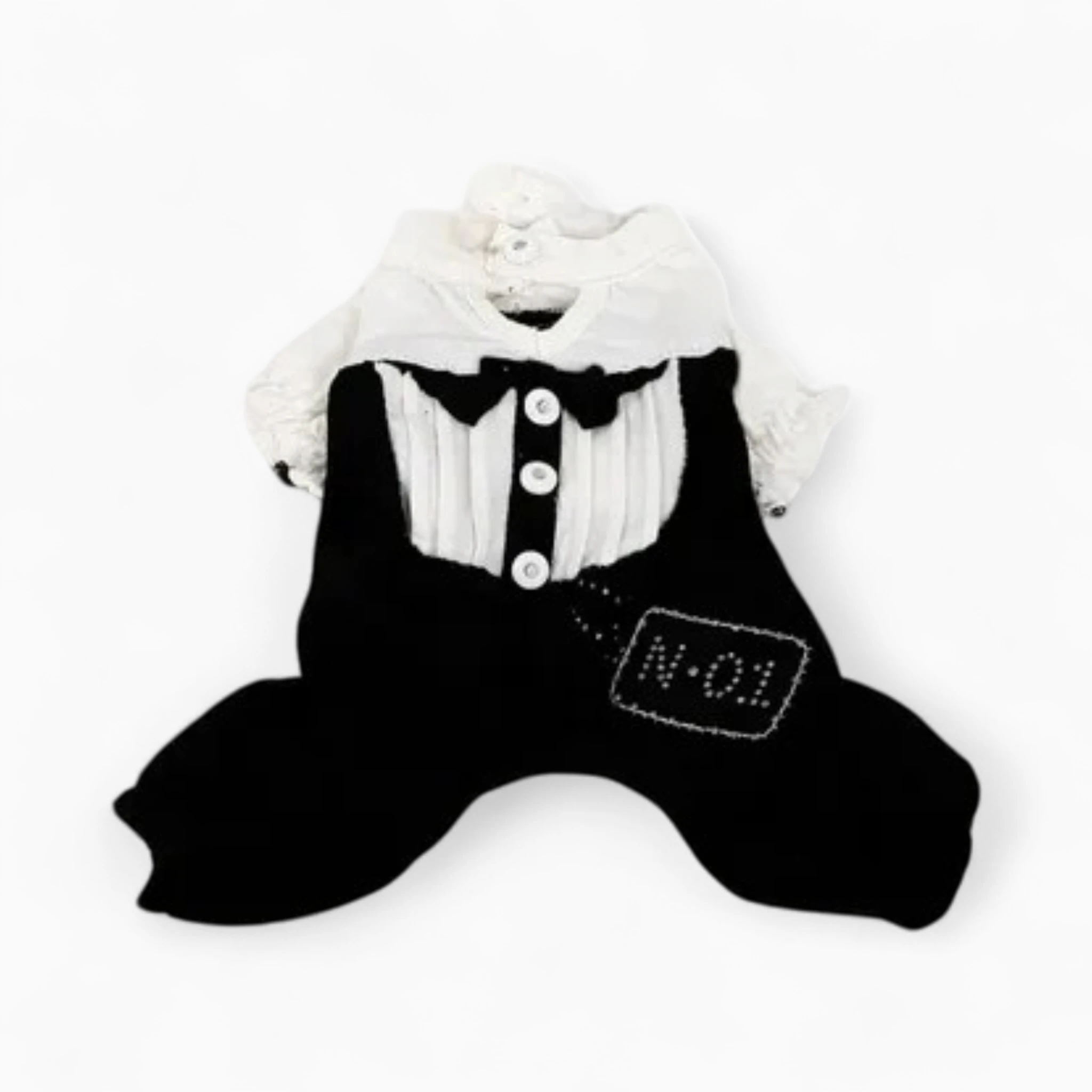 Элегантный дизайн с классическим черно-белым сочетанием, декоративными пуговицами и очаровательной бабочкой придаст питомцу неповторимый шарм. Продуманный крой не сковывает движений, а удобные застежки облегчают одевание, экономя ваше время.