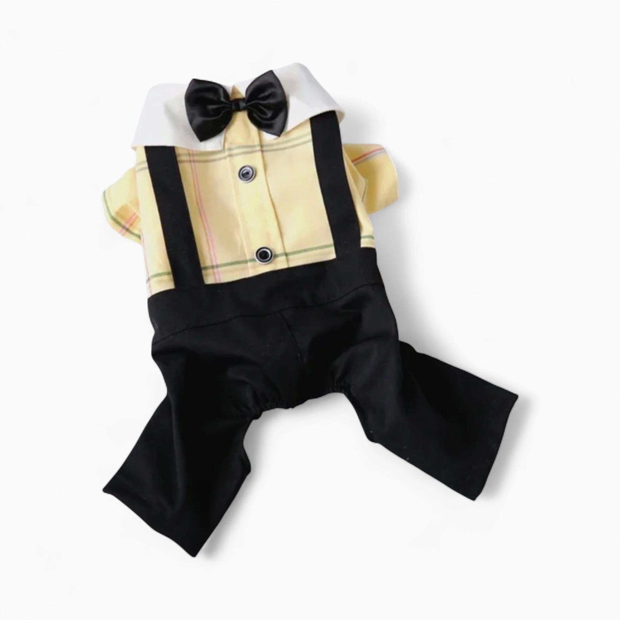 Изготовлен из дышащего материала для максимального комфорта и свободы движений. Дизайн включает клетчатую рубашку с белым воротничком, черную бабочку, стильные подтяжки и брючки. Качественный пошив гарантирует долговечность и безупречный вид изделия.