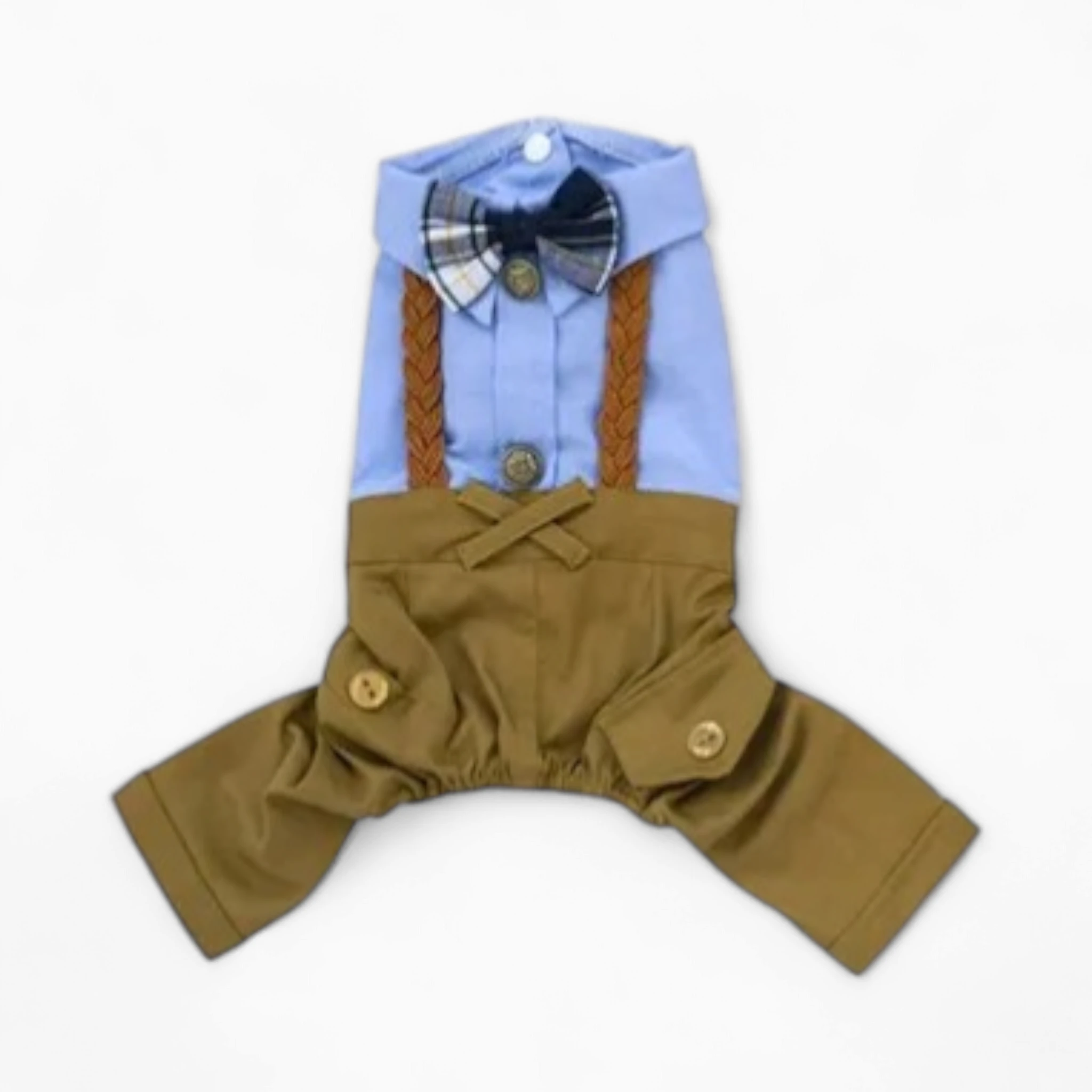 Выполненный из мягкого, дышащего хлопка, костюм обеспечивает нежность к коже и максимальный комфорт. Дизайн включает классическую голубую рубашку, стильный галстук-бабочку в клетку, декоративные плетеные подтяжки и брюки цвета хаки, что демонстрирует высокое качество и внимание к деталям.