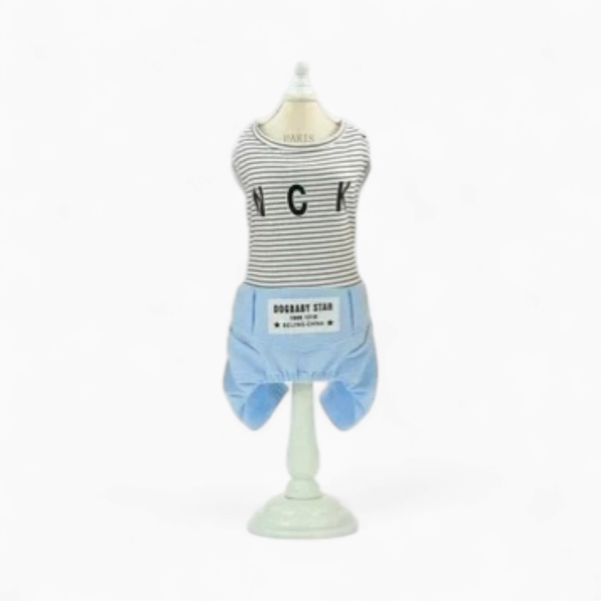 Верх наряда выполнен из мягкого хлопкового трикотажа в полоску, обеспечивая дышащий комфорт. Низ — из легкой, прочной ткани, напоминающей деним. Высокое качество пошива гарантирует долговечность и износостойкость.