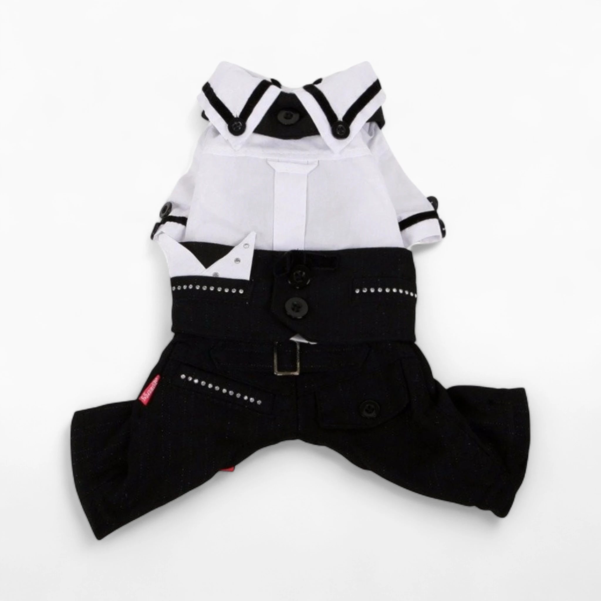 Модель включает белую рубашку из дышащего хлопка с черными акцентами на воротнике/манжетах, жилет и черные брюки из мягкой ткани со стразами. Качественный пошив и продуманный крой гарантируют долговечность, комфорт и свободу движений любимца.