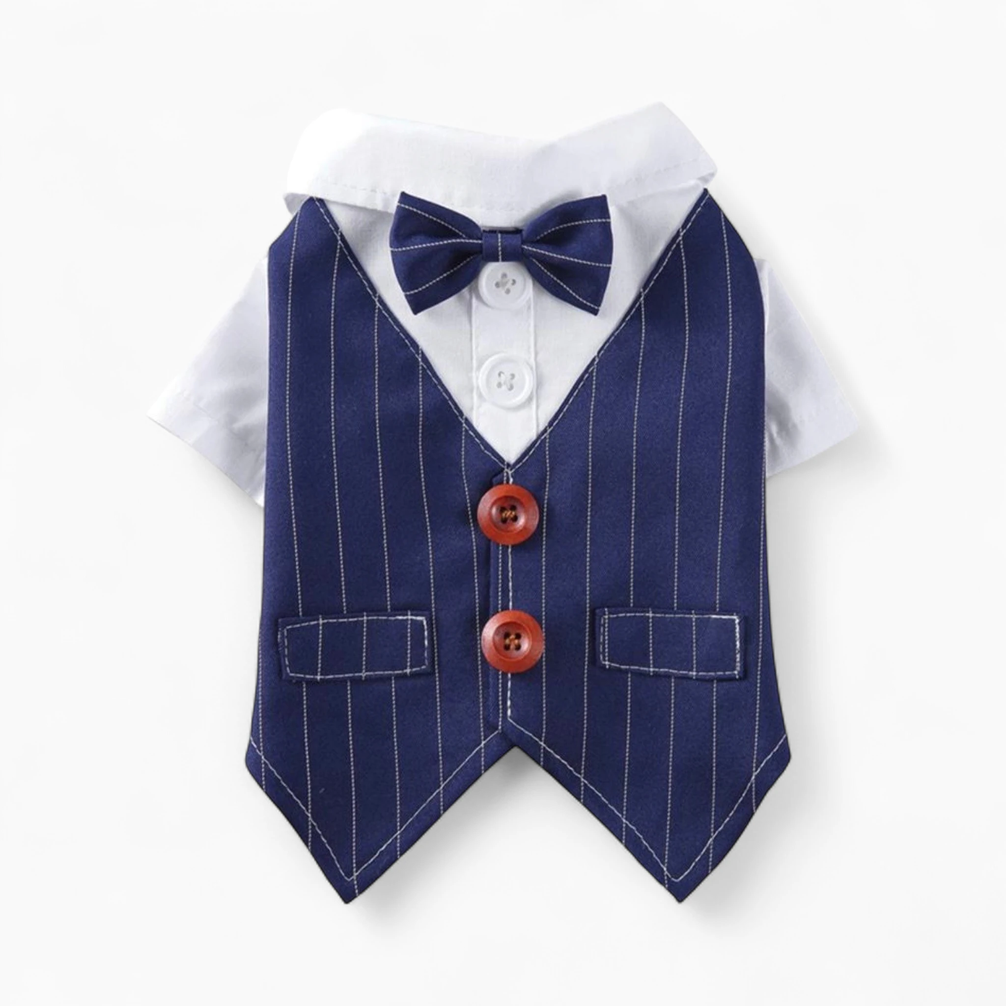 Сшит из высококачественных материалов. Дышащий хлопок рубашки обеспечит комфорт, а прочный жилет из смесовой ткани с тонкой полоской гарантирует безупречный вид. Галстук-бабочка и пуговицы подчеркивают качество.