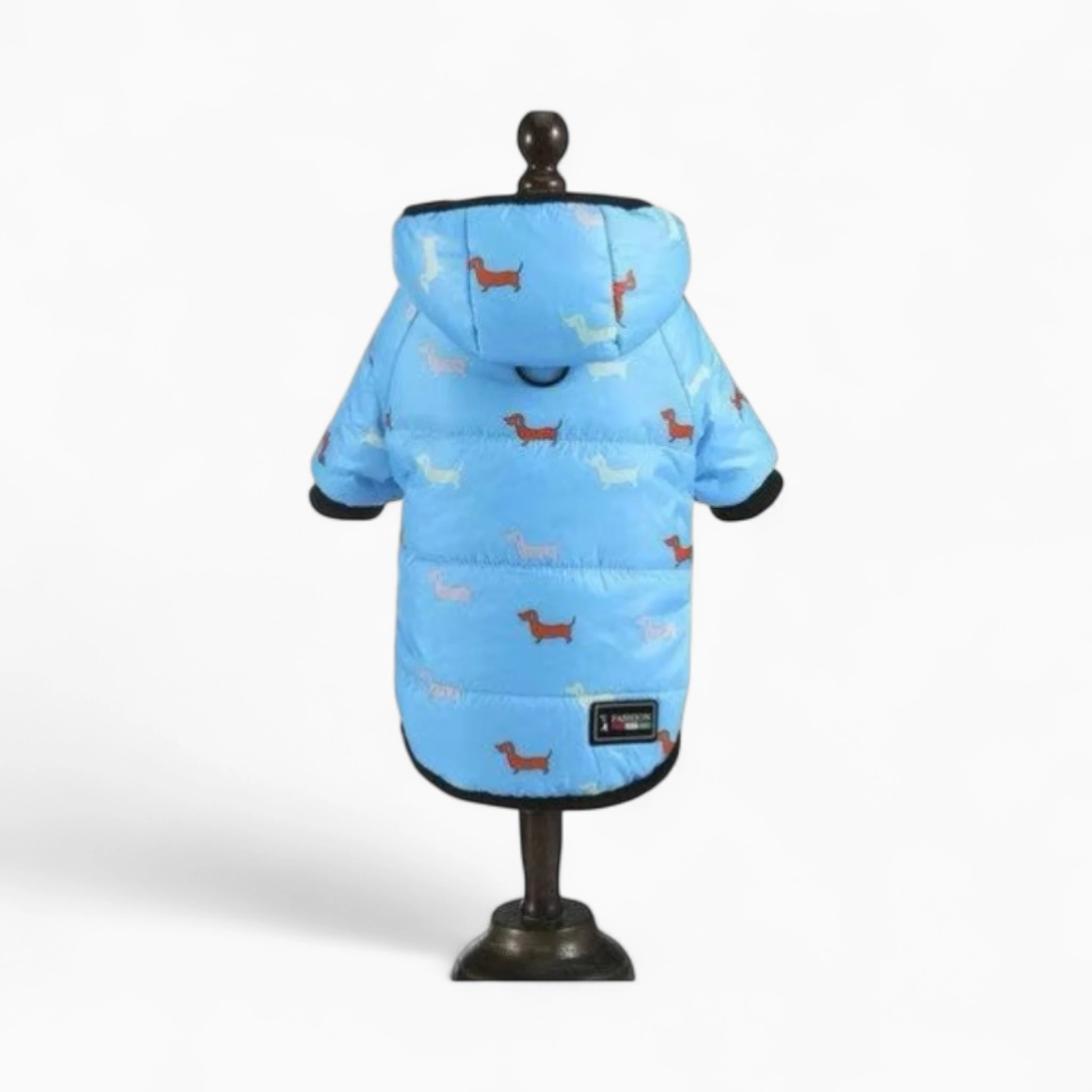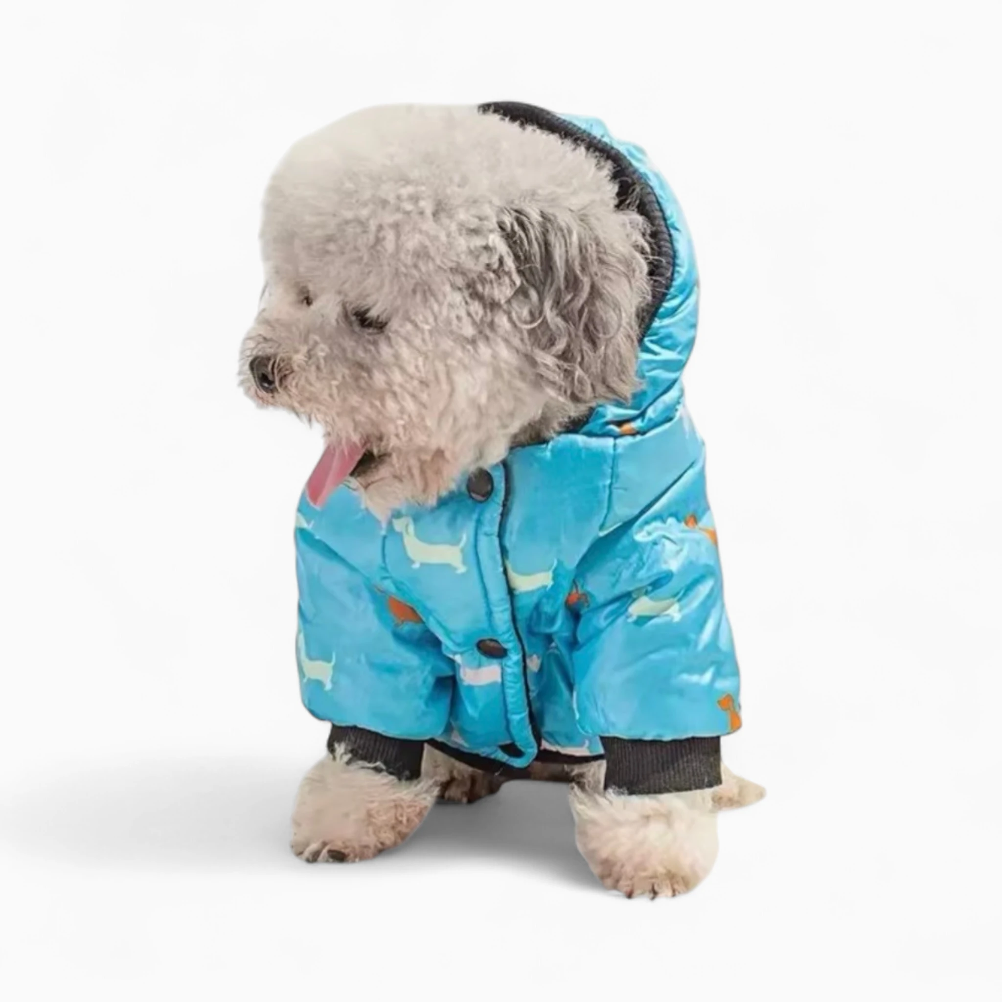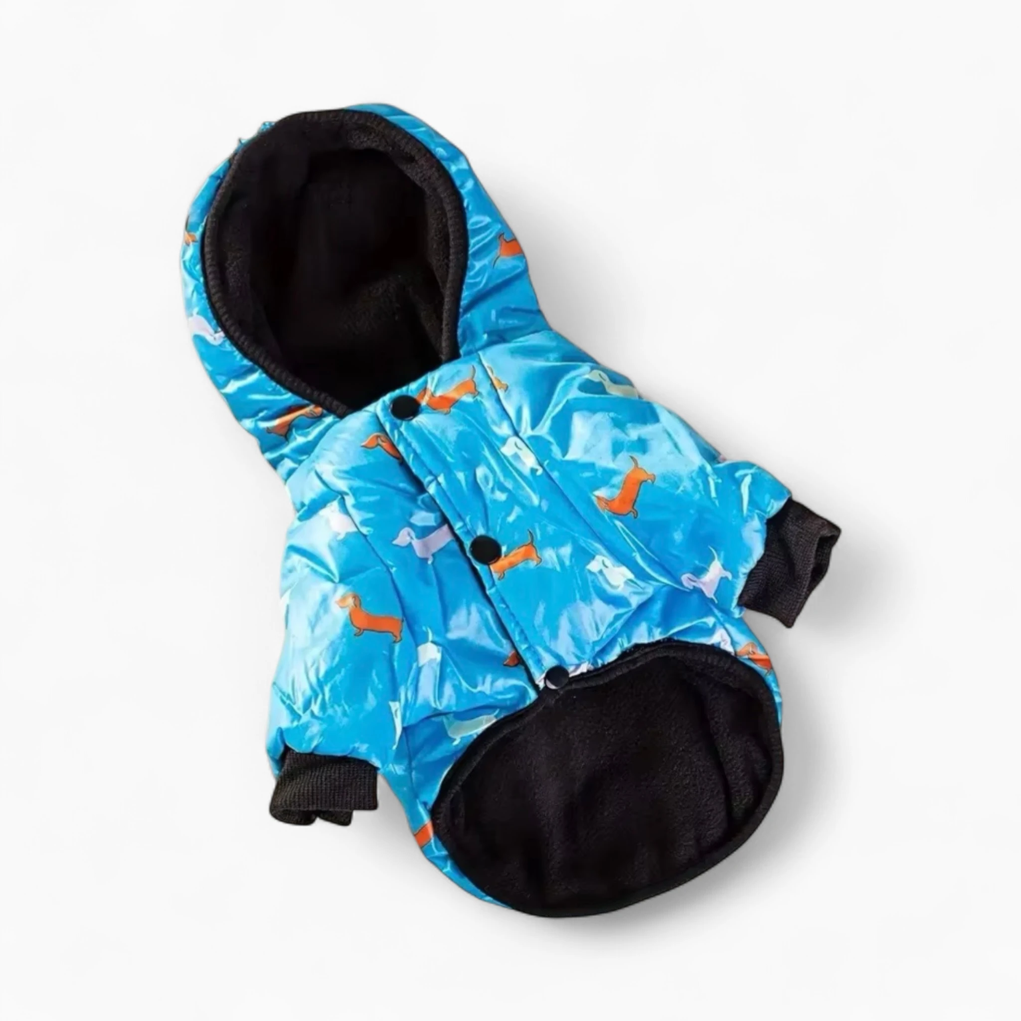 Легкая и не сковывающая движений, эта куртка позволяет собаке активно играть. Оригинальный принт с милыми таксами придает образу питомца уникальный стиль. Удобная застежка и практичный капюшон значительно упрощают процесс одевания и добавляют защиты. Поводок можно пристегнуть прямо к куртке.