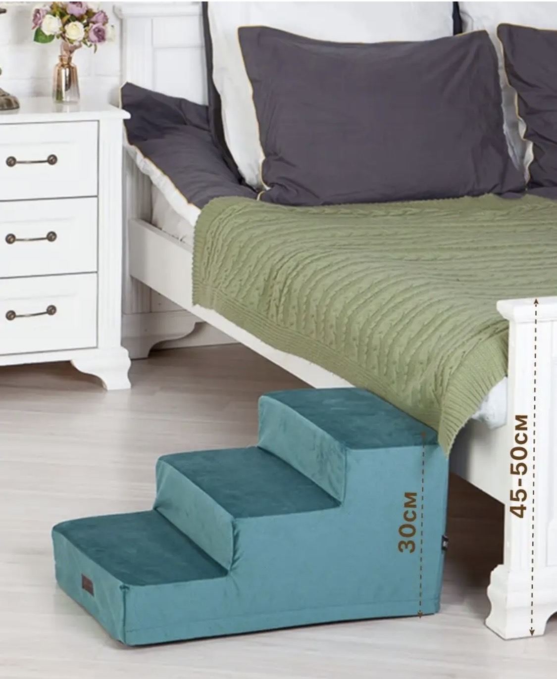 Лестница выполнена из износостойкого велюра мятного оттенка и прочного пенополиуретана. Гипоаллергенные материалы и качественный пошив гарантируют долговечность, безопасность и элегантный вид в интерьере.
