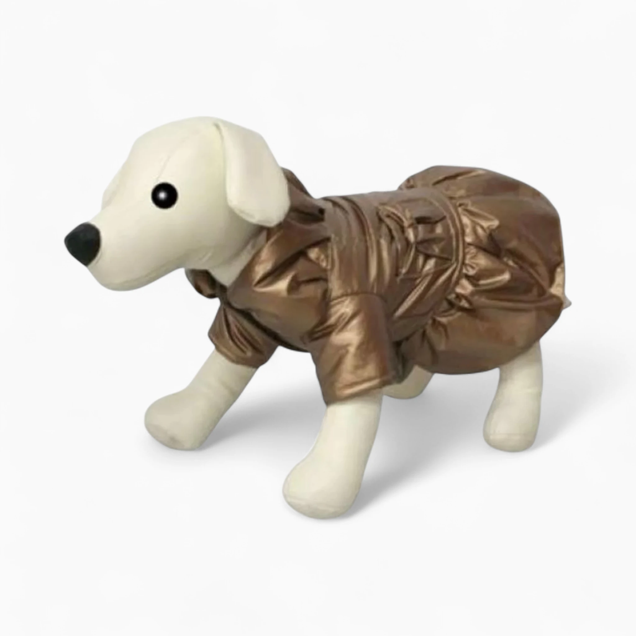 Изготовленное из высококачественной плащевой ткани с утеплителем, на флисовой подкладке это пальто обеспечивает надежную защиту от ветра, прохлады и влаги. Изысканный металлизированный оттенок "золота" придает изделию по-настоящему эксклюзивный вид, подчеркивая безупречный вкус владельца и уникальность собаки.