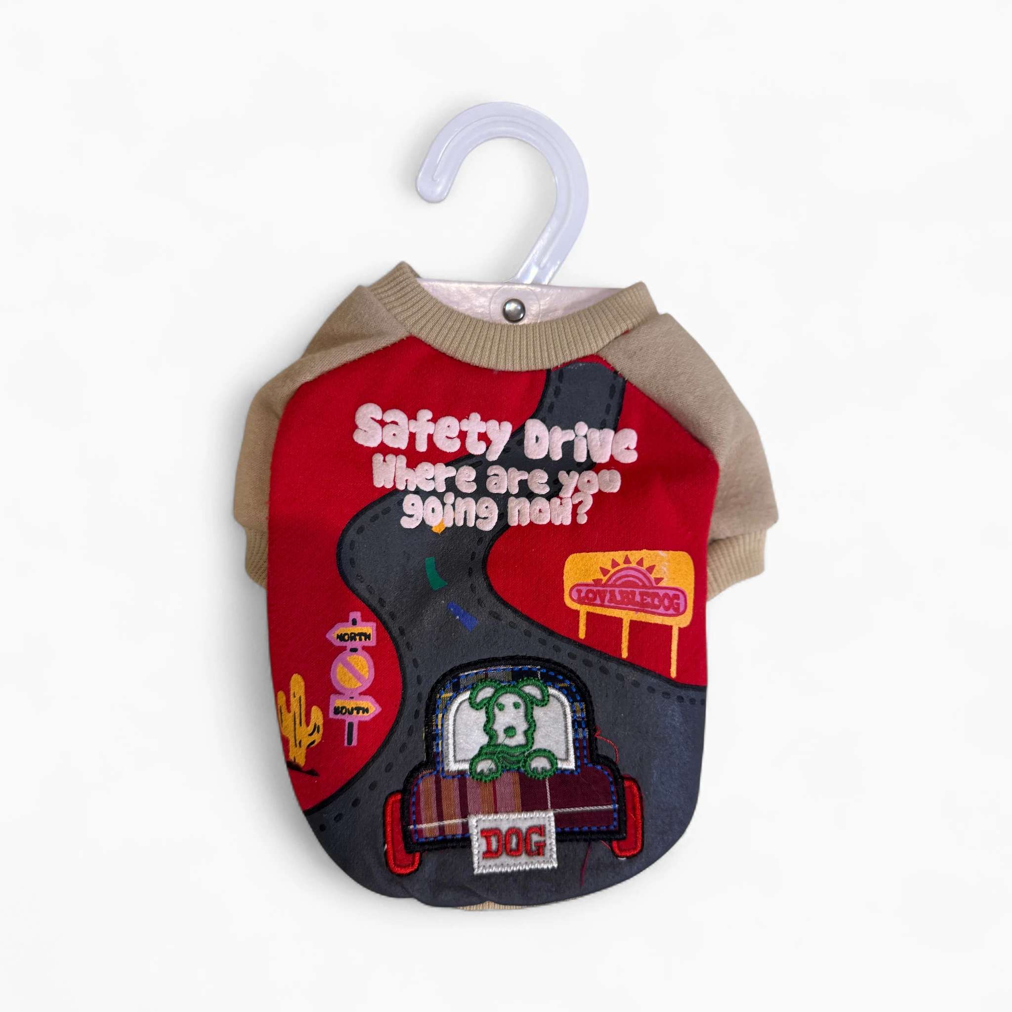 Изготовлена из мягкого, дышащего трикотажа, приятна к телу. Качественные швы и яркий принт (собака в машине, дорога, надпись «Safety Drive Where are you going now?») гарантируют долговечность. Контрастные бежевые рукава и красный фон дополняют образ.