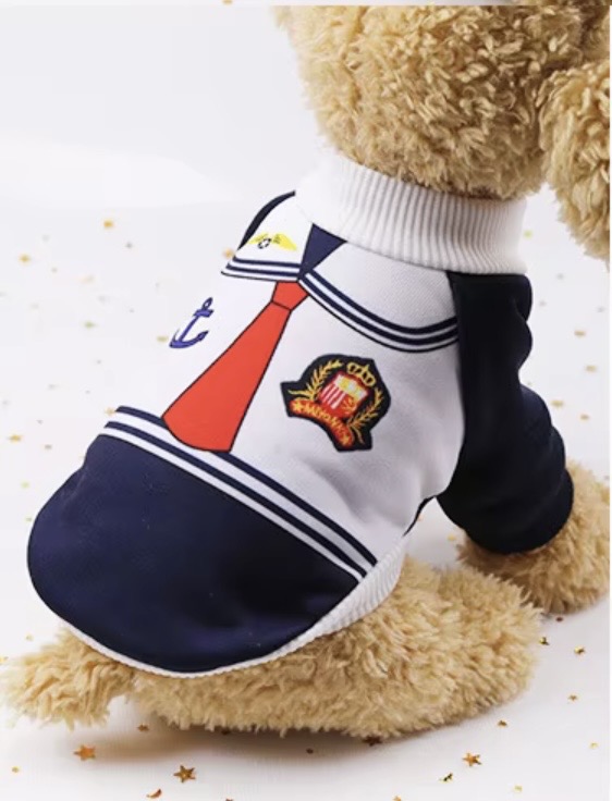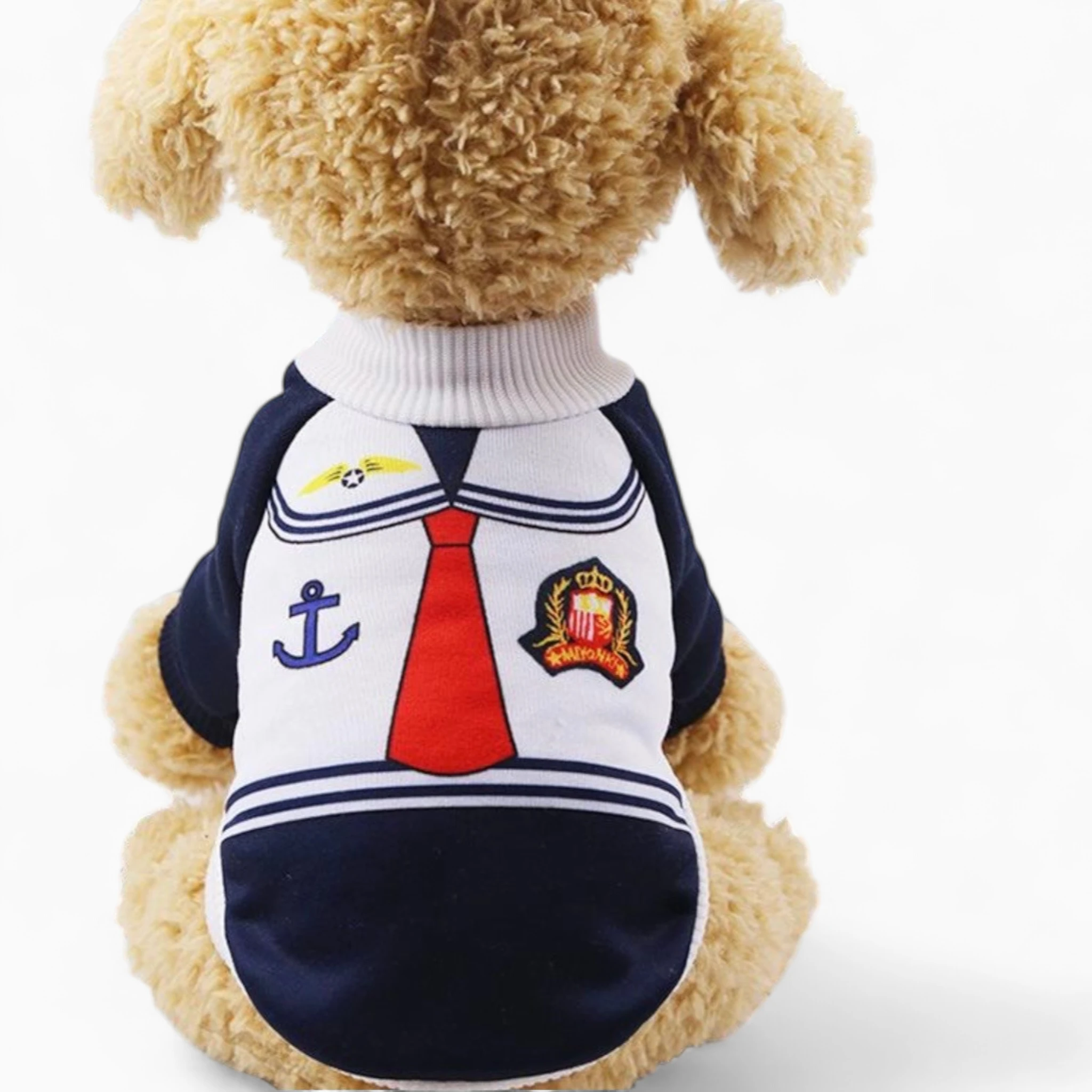 Морской дизайн с воротником, красным галстуком и яркими нашивками (якорь, эмблема, крылья) придаст питомцу уникальный шарм. Эластичные манжеты и горловина обеспечат комфортную посадку. Это забота о вашем друге: защита от прохлады и стильное подчеркивание его индивидуальности.
